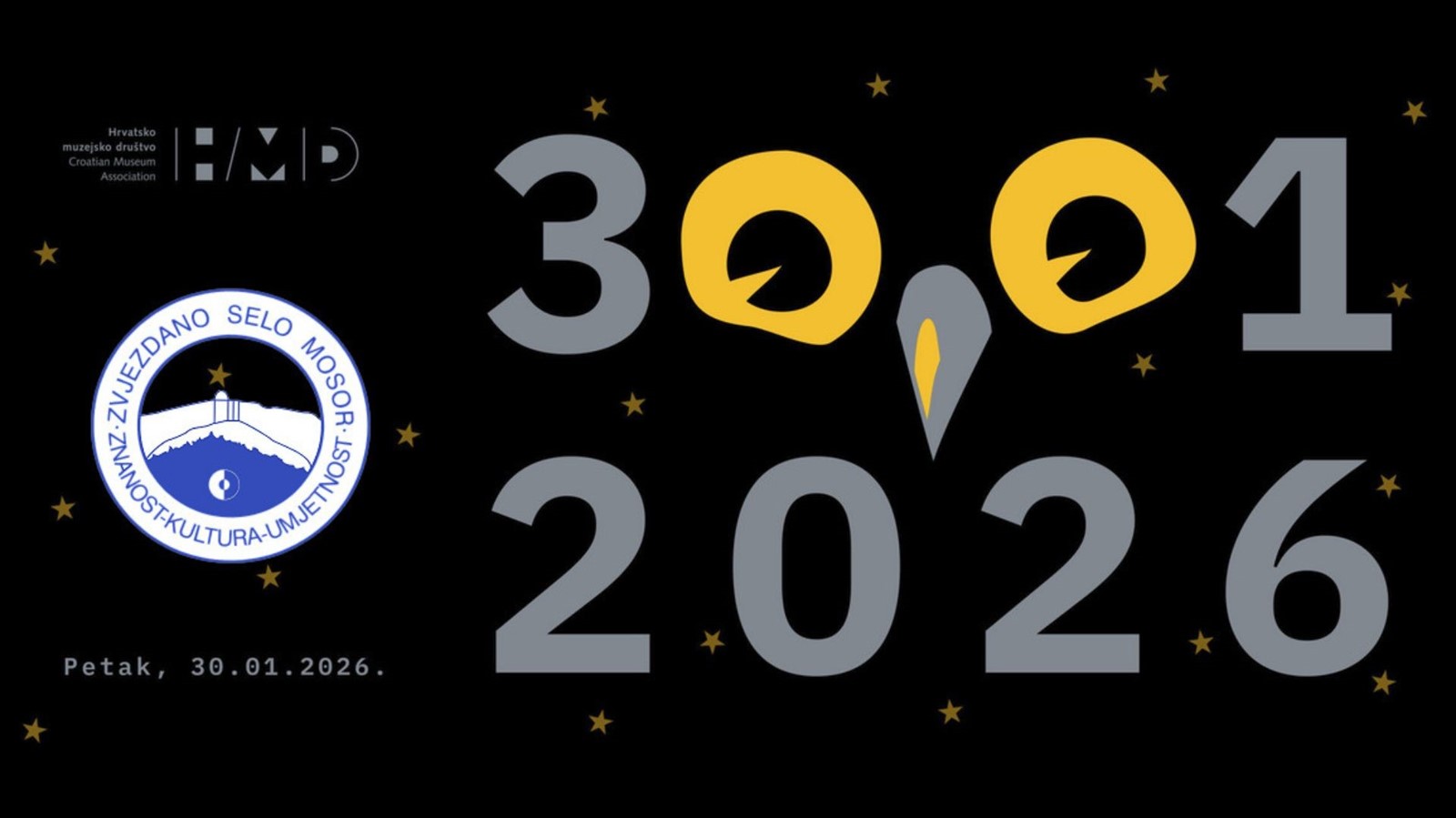 U akciju “Noć muzeja“ se po petnaesti put uključuje i udruga Zvjezdano selo Mosor. Manifestacija će biti održana u petak, 30. siječnja 2026. g., u večernjim satima. Program će biti izveden u zvjezdarnici na Mosoru, a imat će sljedeći sadržaj: 18:00 – 18:15 h Izložba fotografija „Razorna moć prirode” najpoznatijeg hrvatskog lovca na oluje i nagrađivanog fotografa Sandra Punceta. 18:30 – 19:00 h Predstavljanje slikovnice „Sretno stablo i Florijan“. Uz autoricu teksta Vesnu Jukić-Oštrek i ilustratoricu Donu Tomić, ovu slikovnicu o nježnom prijateljstvu stabla i dječaka će predstaviti i Siniša Gašparević, direktor tvrtke „Parkovi i nasadi“, te učenik četvrtog razreda Karlo Brešković. 19:00 – 19:15 h Nastup školskog zbora OŠ Kman-Kocunar, pod ravnanjem prof. Mirele Todorić (prvi dio). 19:15 – 19:30 h Projekcija eksperimentalnih filmova Marea i TICA splitske vizualne umjetnice Jane Matošić. 19:30 – 19:45 h Nastup školskog zbora OŠ Kman-Kocunar, pod ravnanjem prof. Mirele Todorić (drugi dio). 19:45 – 20:15 h Astronomsko promatranje neba s terase zvjezdarnice Zvjezdanog sela Mosor (ako to vremenski uvjeti dopuste), pod vodstvom astronoma-animatora ZSM-a Zorana Kneza (prvi dio). 20:15 – 20:45 h Igrokaz u izvedbi učenika 3. b razreda OŠ Kman-Kocunar, a pod vodstvom Sanje Sekereš, Tatjane Božan i Sanje Sinovčić. 20:45 – 21:00 h Nastup članova Udruge hrvatskih aforista i humorista - Nađan Dumanić, Tomislav Mihanović i Ivan Bašić - govorit će šaljive pjesme, aforizme i humoreske. 21:00 – 21:15 h Pjesnikinja Željka Šabić iz Splita će pročitati nekoliko odabranih pjesama iz svojih digitalnih zbirki poezije. 21:15 – 21:45 h Trojanski kustos predstavlja: subverzivnu poetiku Jakše Matošića - i obrnuto, u izvedbi splitskog multimedijalnog autora Jakše Matošića. 21:45 – 22:15 h Stand up nastup lovrećkog glumca Petra Sekeleza pod nazivom L'amore Eterna. 22:15 – 22:45 h Ivo Ćurković i Branko Tomaš će na gitari, odnosno na mandolini izvesti glazbeni intermezzo Kroz Dalmaciju. 22:45 – 23:45 h Znanstveno-popularno predavanje „Pomrčine u prošlosti i budućnosti“. Predavanje će održati Damir Hržina, djelatnik Zvjezdarnice Zagreb. 23:45 – 01:00 h Astronomsko promatranje neba s terase zvjezdarnice Zvjezdanog sela Mosor (ako to vremenski uvjeti dopuste), pod vodstvom astronoma-animatora ZSM-a Zorana Kneza (drugi dio). Zvjezdarnica Zvjezdanog sela Mosor će biti otvorena od 18.00 do 01.00 h, a ulaz je za sve besplatan.
