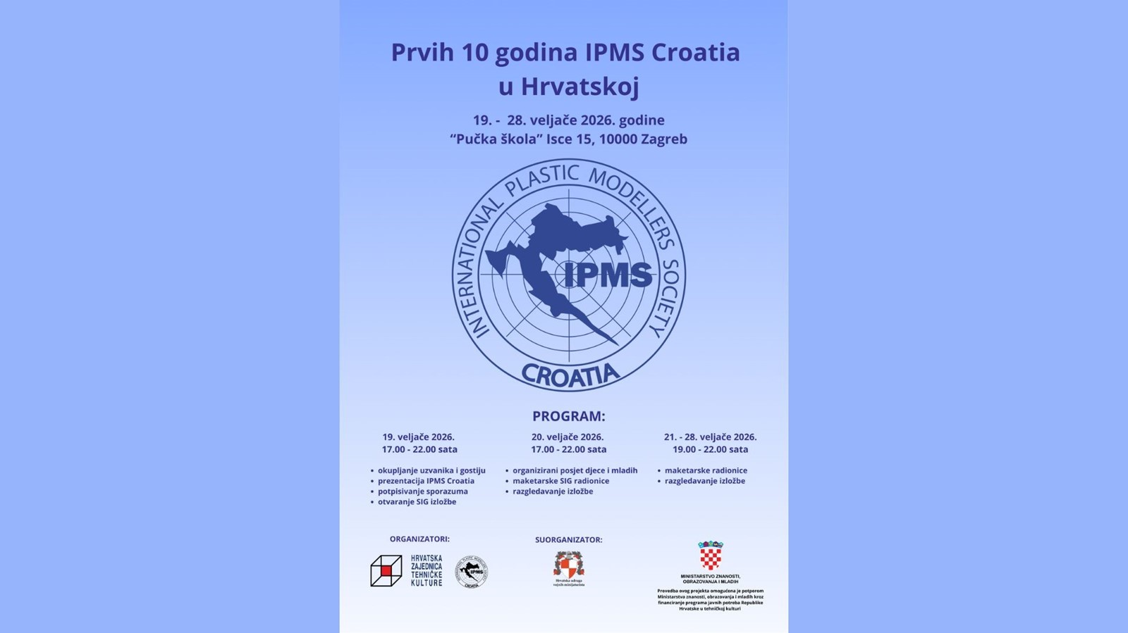 Povodom obilježavanja 10 godina rada međunarodne maketarske podružnice u Republici Hrvatskoj IPMS Croatia, tijekom 2026. godine planira se održavanje više maketarskih manifestacija u sklopu kojih će sudjelovati i Hrvatska zajednica tehničke kulture. Prvo u nizu spomenutih događanja, održati će se od 19. do 28. veljače 2026. godine u klupskim prostorijama Hrvatske udruge vojnih minijaturista na adresi Isce 15, 10000 Zagreb, u sklopu kojih će biti postavljene tri maketarske izložbe vrlo interesantnog sadržaja. Veselimo se Vašem dolasku i posjeti ovome događanju!